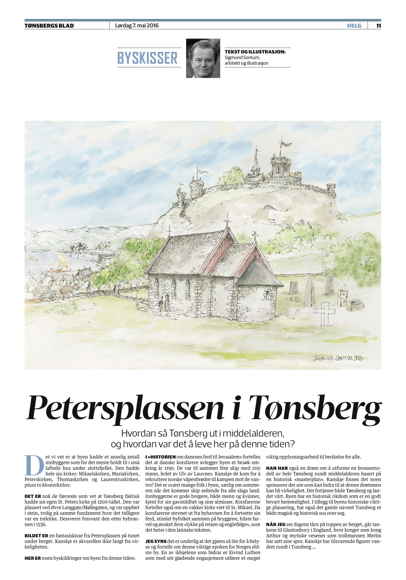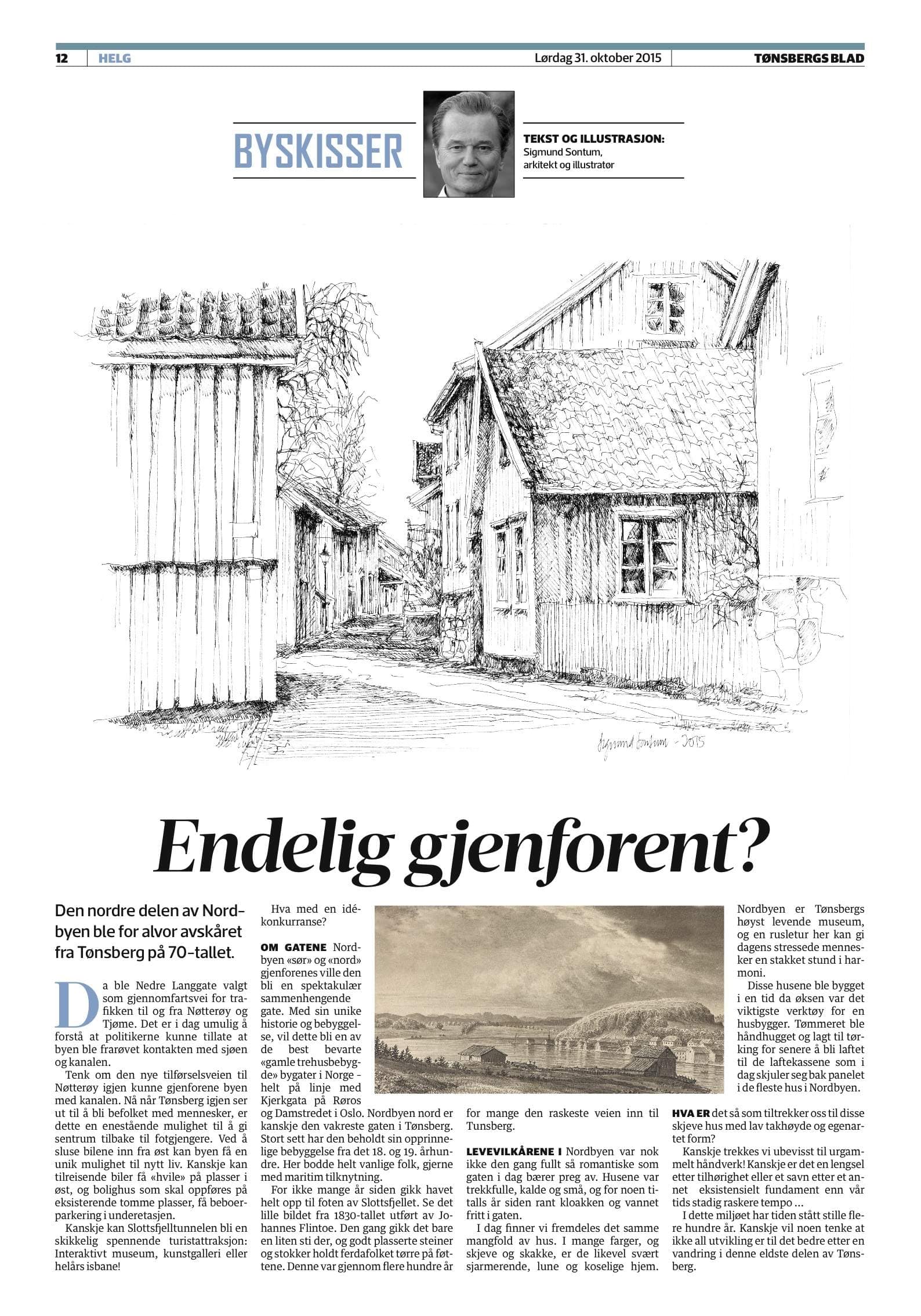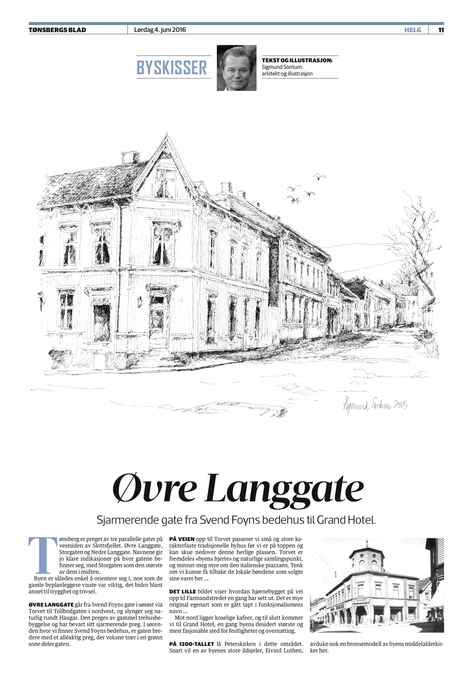 De store åpne plasser langs denne tidligere riksveien skal fylles med boliger og forretninger, eksisterende bebyggelse er under utvikling og selve gateløpet skal omformes. Det er grunn til å foreta «dypdykk» i byens historie og identitetsutvikling for at Tønsberg skal bli beriket på verdig måte. Det er det viktig å forstå hvordan byen ble formet gjennom tusen år lang historie, når den nå skal utvikles gjennom grep som vil få stor betydning for vår tilhørighet og våre opplevelser.