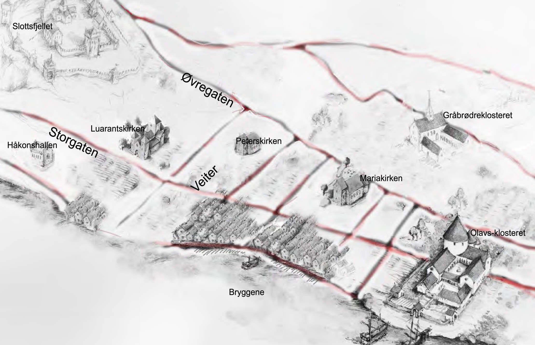 Tønsberg by fremstår I dag med alle sine gateløp mer eller mindre intakte siden middelalderen. De “lange” gatene – Øvre Stræti, Store Stræti og Nedre Stræti - ligger alle mer eller mindre slik de alltid har gjort. De smale veitene som gikk fra langgatene ned til fjorden, ligger også der de alltid har gjort. Storgaten som den heter i dag, skal ifølge kilder for det meste ha den samme form og bredde som den hadde i middelalderen.